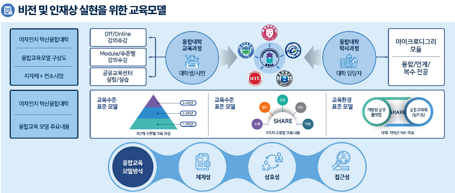- 이차전지는 다양한 신산업 분야에서 필수적인 중요 부품으로써 세계적인 수요가 증가하고 있습니다. 따라서 이차전지는 현재를 넘어 미래가 더욱 기대되는 고부가가치 학문분야입니다. “세계 이차전지 산업을 선도하는 자율과 창의 중심의 융합형 첨단 인재 양성”이 이차전지 혁신융합전공의 비전이며, 융합형 첨단 인재 양성을 위해 대학간・학제간 제약 없는 자율적인 교육 체계 구성과 급성장하는 이차전지 산업에서 새로운 가치를 창출하는 창의를 핵심 지향점으로 설정하였습니다. 이러한 융합형 이차전지 혁신융합전공 이수를 통해 이차전지 소재/분석, 제조/공정, 진단/안전, 장비/시스템 및 자원순환의 다양한 영역에 걸쳐 이론교육을 통해 주요한 지식을 함양하고, 실질적인 설계·실습을 통해 현장 중심형 핵심 인력을 양성하고자 합니다. 이를 바탕으로 이차전지 분야 대기업 및 중견·중소기업, 연구소 분야 등에 필요한 고급인재 배출을 목표로 하고 있습니다.