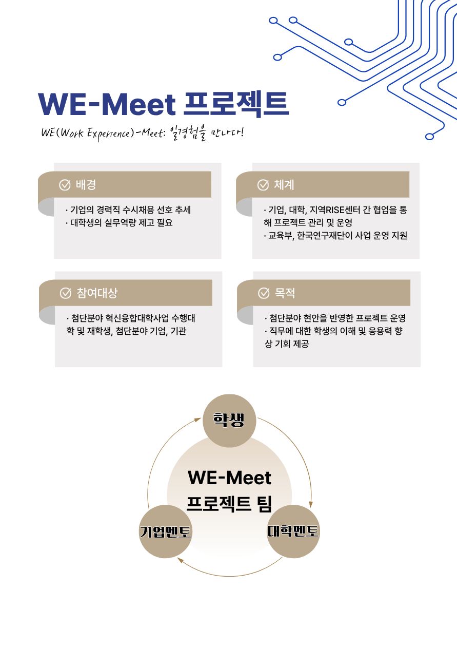 위밋 프로젝트(WE-Meet:Work Experience Meet=일경험을 만나다)는 교육부와 한국연구재단이 협력하여 진행하는 일 경험 프로젝트로, 기업 멘토와 함께 실험 실습을 통한 문제해결형 프로젝트입니다. 기업이 제시한 프로젝트를 학생이 직접 수행하고, 재직자 멘토링과 인턴십 등을 결합하여 현장 직무역량 제고 및 취업 기회를 확대하고자 합니다.