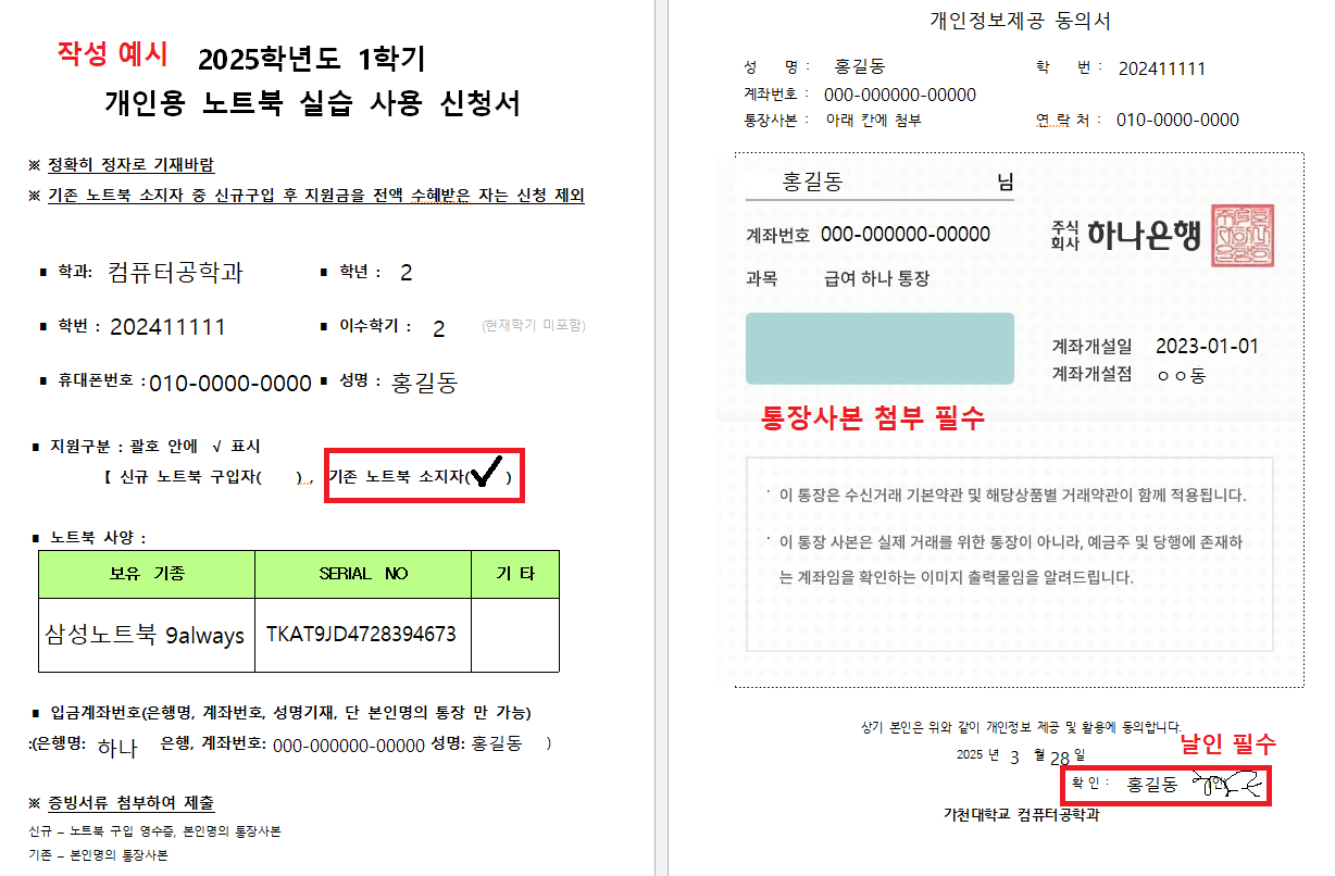 - 신규 : 신청서, 통장사본, 영수증(금액 필수, 날짜와 노트북이라고 명시되어 있어야 함, 주문내역 안됩니다)