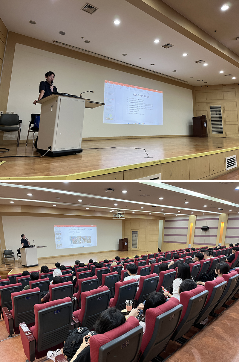건축학전공 소속 전체 재학생 및 교수님들이 참석한 가운데 2025학년도 2학기 학사운영에 관한 소개가 진행되었습니다.