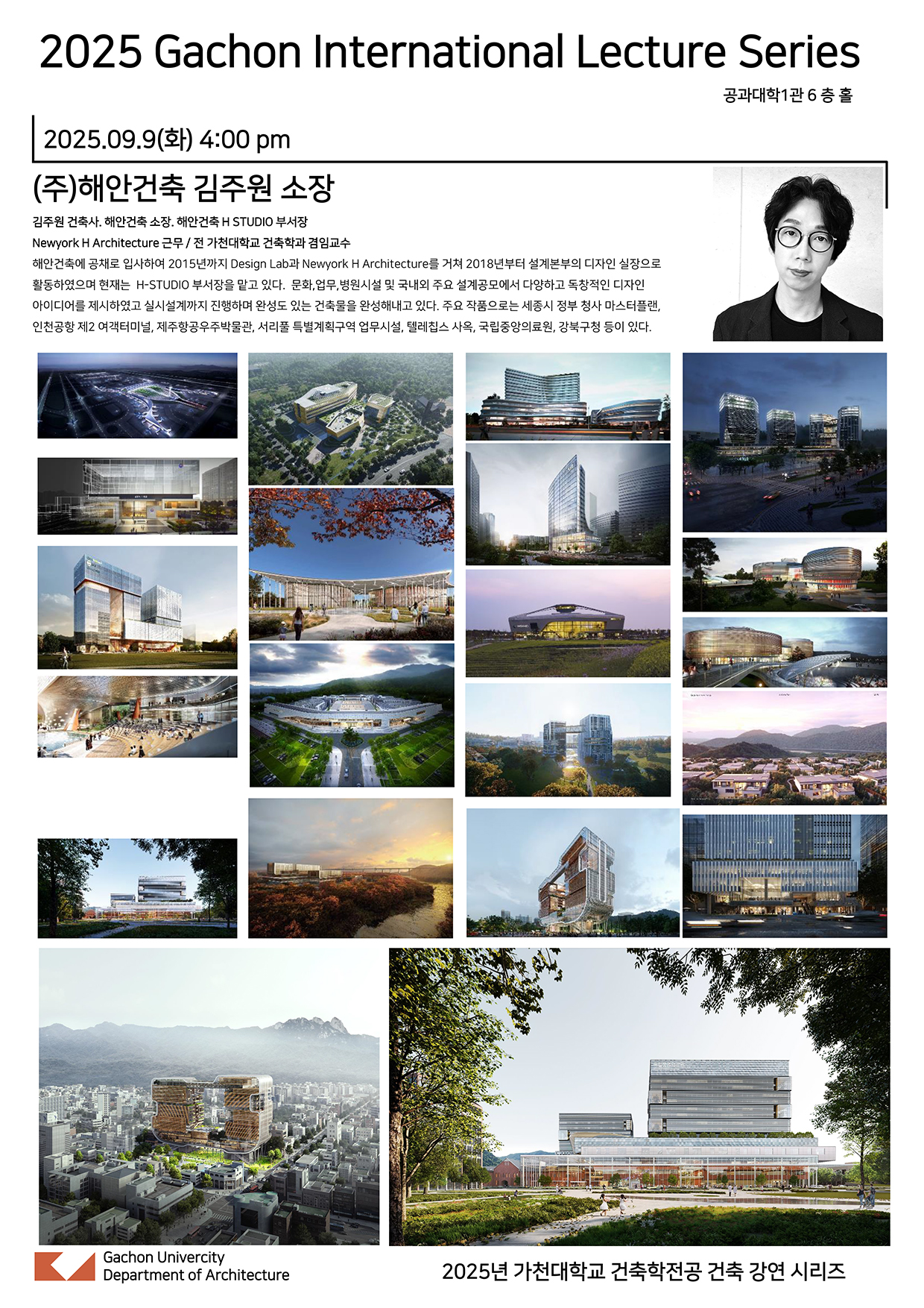 fnctId=bbs,fnctNo=945 글번호 112970 2025 가천대학교 건축학전공 취업 특강. 2차 수정일 2025.09.29 작성자 건축학부 조회수 108 등록일 2025.09.08 해안건축사무소 소개 및 취업특강이 진행됩니다.