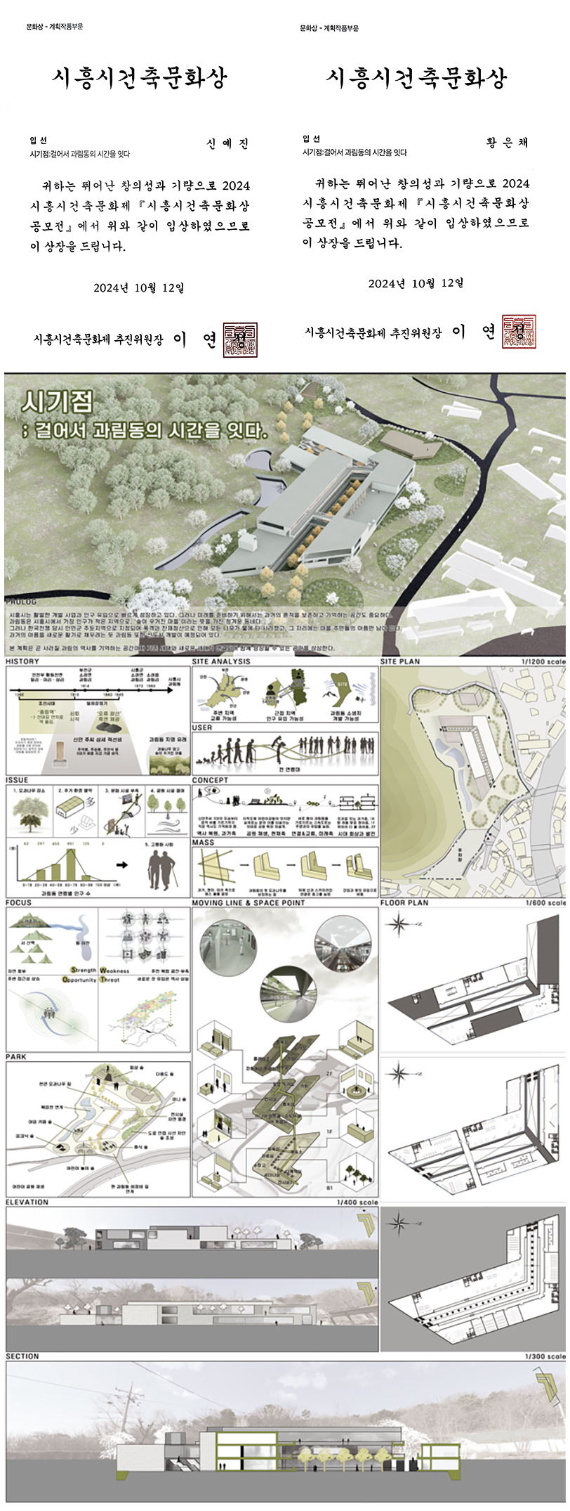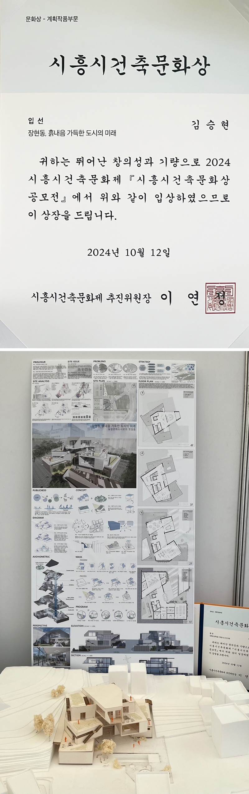 가천대학교 건축학전공 김승현(4)학생, 황은채(3), 신예진(3) 학생이 2024 시흥시 건축문화상 공모전에서 입선하였습니다.
