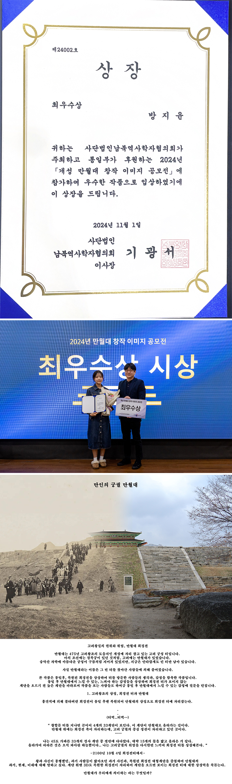 가천대 건축학전공 방지윤(4) 학생이 개성 만월대 창작 이미지 공모전에서 최우수상을 수상하였습니다.