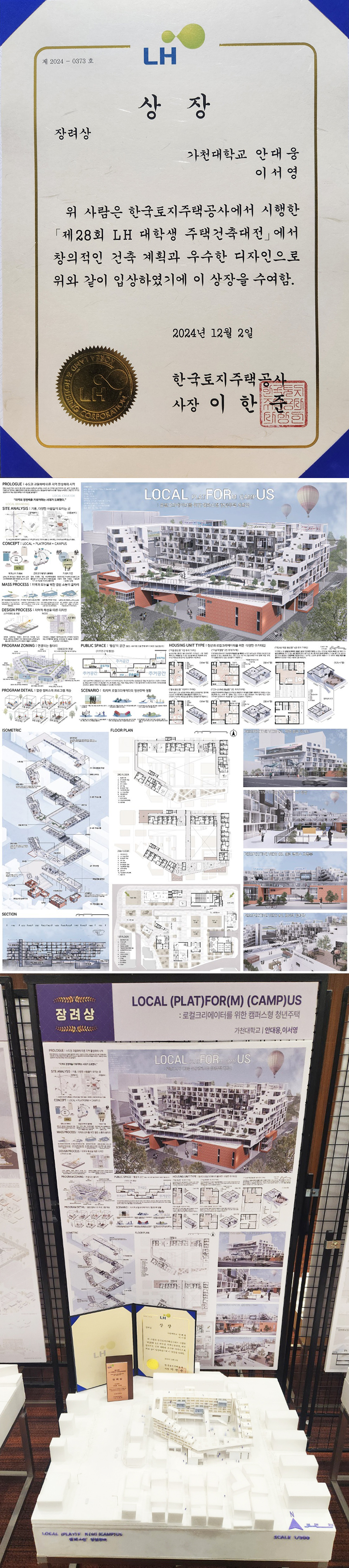 제 28회 LH 대학생 주택건축대전에서 가천대 건축학전공 이서영(4학년), 안대웅(4학년) 팀이 장려상을 수상하였습니다.