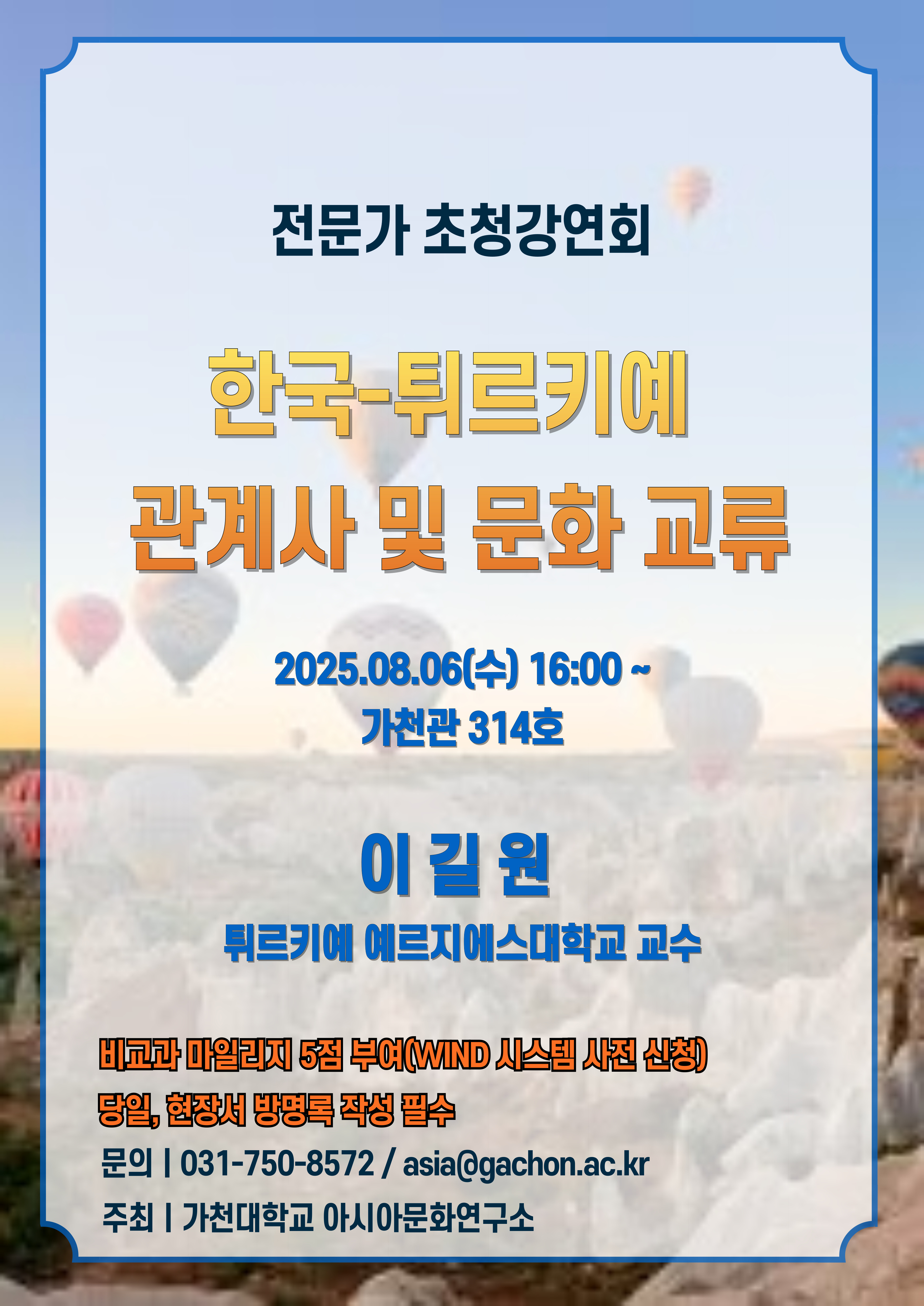 이번 강연회에서는 이길원 교수께서 ‘한국-튀르키예 관계사 및 문화교류’라는 주제로 강연을 진행할 예정입니다.