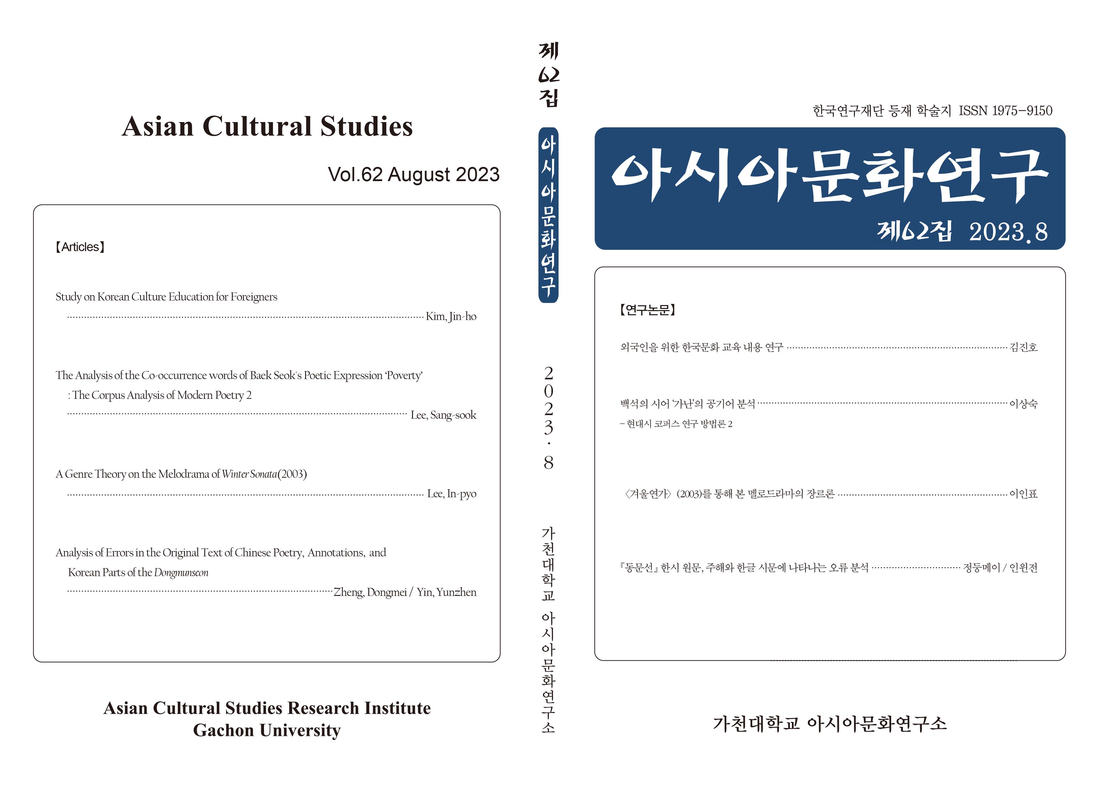 fnctId=bbs,fnctNo=398 글번호 103698 『아시아문화연구』제62집(2023.08.31) 수정일 2024.11.27 작성자 아시아문화연구소 조회수 457 등록일 2024.11.27 『아시아문화연구』 제62집(2024.08.31) 가천대학교 아시아문화연구소 발간 첨부파일 00 제62집목차.pdf 미리보기 01 김진호 외국인을 위한 한국문화 교육 내용 연구(5~36).pdf 미리보기 03 이인표 겨울연가(2003)를 통해 본 멜로드라마의 장르론(73~100).pdf 미리보기 04 정둥메이(鄭冬梅),인윈전(尹允鎮) 『동문선』 한시 원문, 주해와 한글 시문에 나타나는 오류 분석(101~125).pdf 미리보기 02 이상숙 백석의 시어 가난 의 공기어 분석-현대시 코퍼스 연구 방법론2(37~72).pdf 미리보기