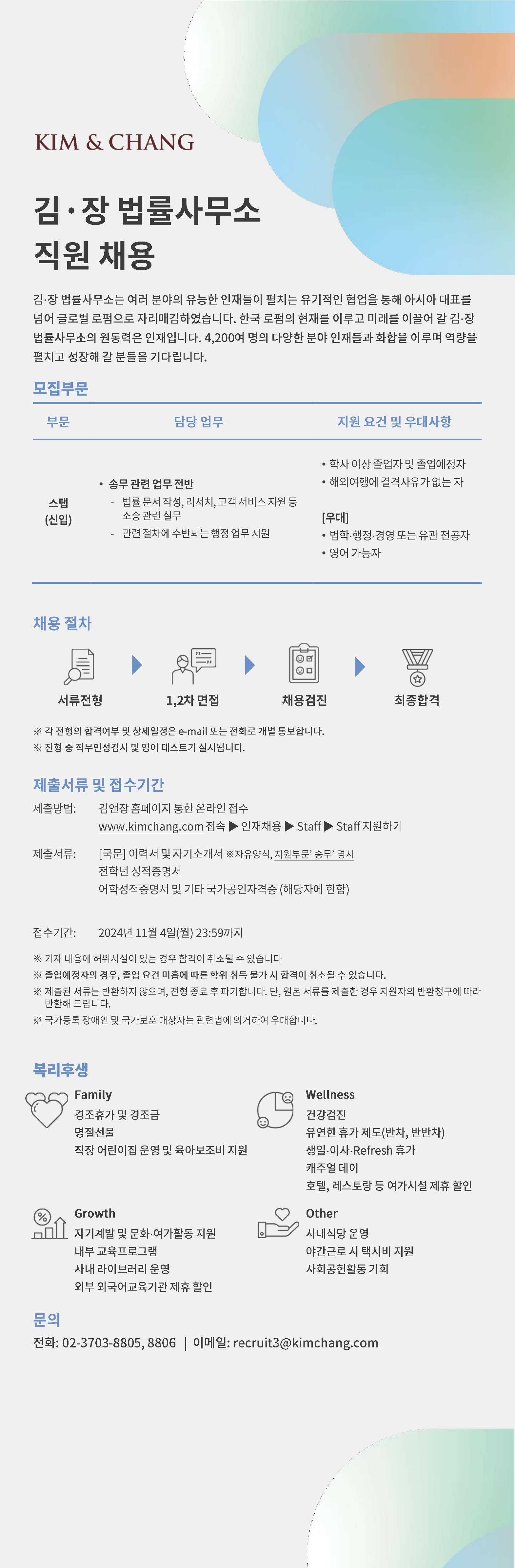 fnctId=bbs,fnctNo=793 글번호 102404 [채용공고] 김&장 법률사무소 직원 채용 분류 채용공고 수정일 2024.10.22 작성자 경영학부 조회수 880 등록일 2024.10.22 첨부파일 [채용 공고] 스탭(신입) 24.11.4 마감.pdf 미리보기
