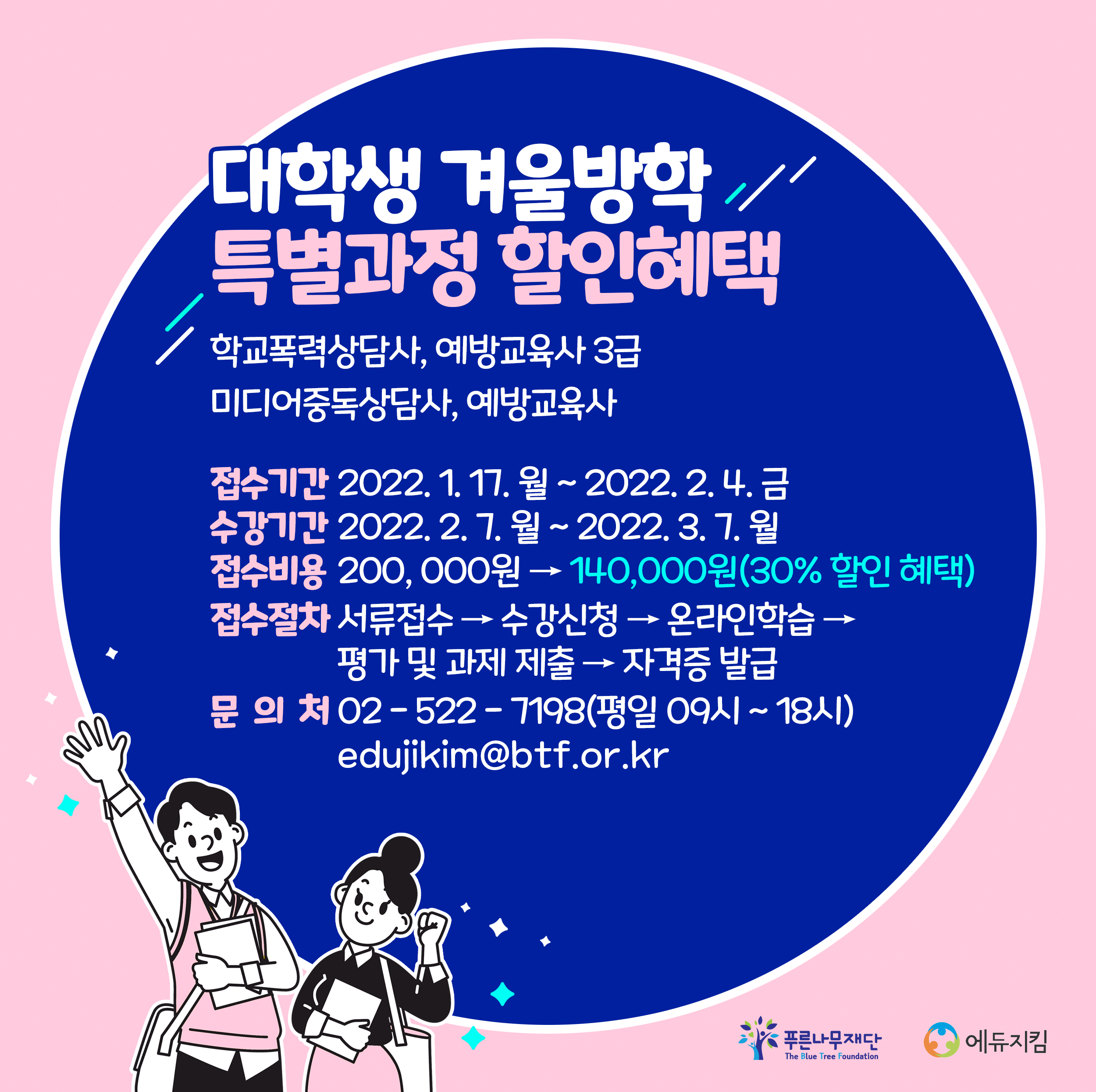 자세한 신청 방법은 [푸른나무재단 에듀지킴 홈페이지 - 공지사항 - 대학생 겨울방학 특별과정] 을 참고 바랍니다.