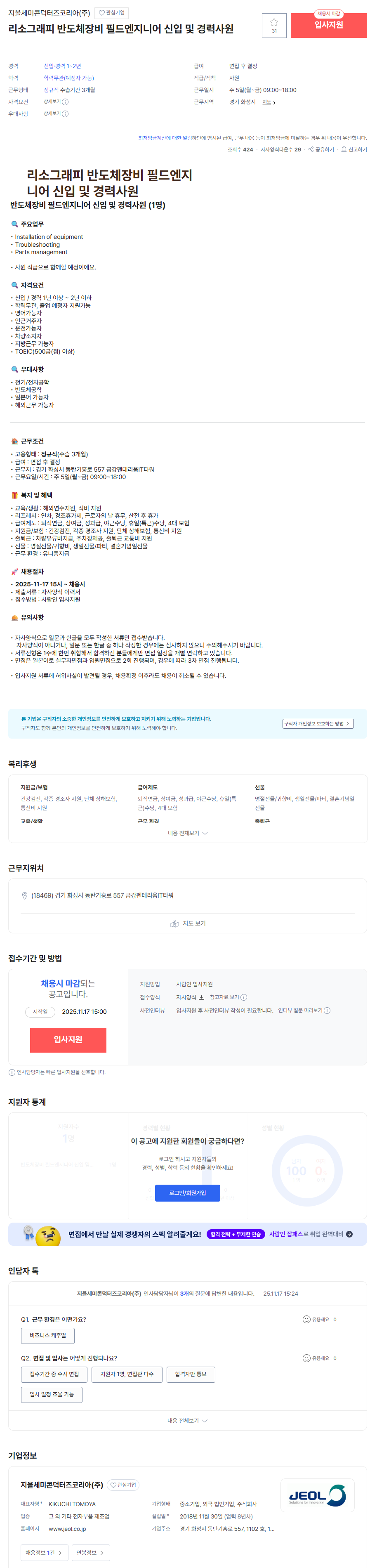 fnctId=bbs,fnctNo=1599 글번호 115029 [채용공고] 지올세미콘덕터즈코리아(주) 필드엔지니어 신입 및 경력사원 수정일 2025.11.19 작성자 반도체특성화대학사업단 조회수 387 등록일 2025.11.19 https://buly.kr/44ym56G 채용공고 바로가기