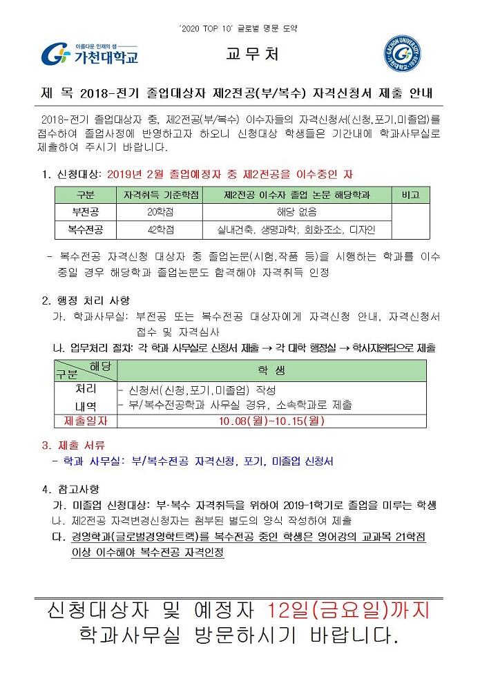 fnctId=bbs,fnctNo=952 글번호 29202 2018-전기 졸업대상자 제 2전공 자격신청서 제출안내 공지 수정일 작성자 건축공학과 조회수 861 등록일 2018.10.10 첨부파일 제2전공자격변경신청서(졸업학기자).hwp 미리보기 부전공,복수전공자격취득(신청,포기)신청서.hwp 미리보기 제2전공자격취득관련미졸업신청서.hwp 미리보기