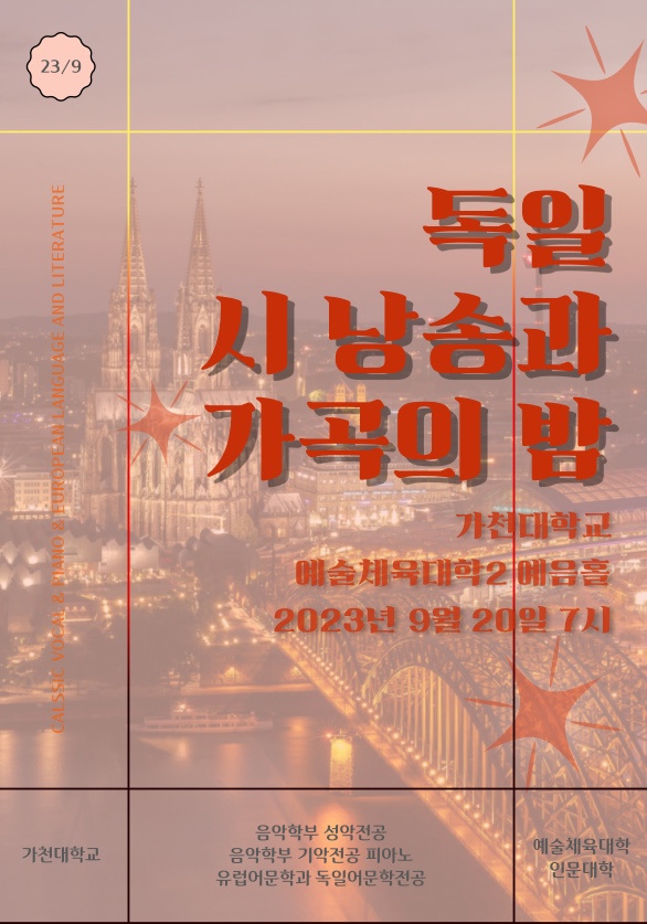 2023년 9월 20일 오후 7시에 예음홀에서 독일 시 낭송과 가곡의 밤이 진행됩니다.