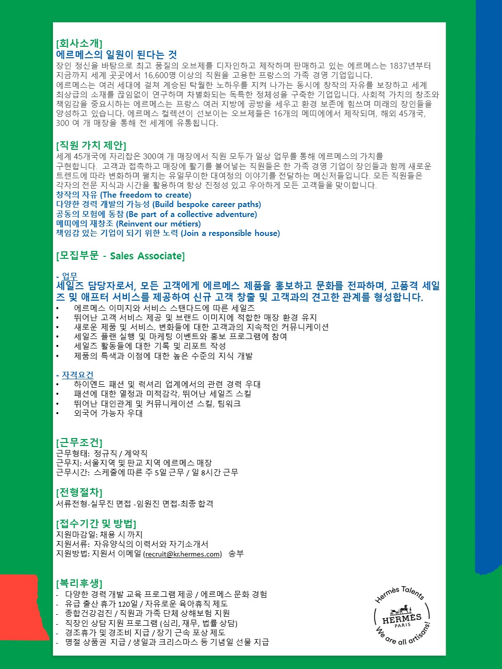 - Sales Associate 채용: 세일즈 직무 / 서울 및 판교 지역 내 에르메스 매장 근무