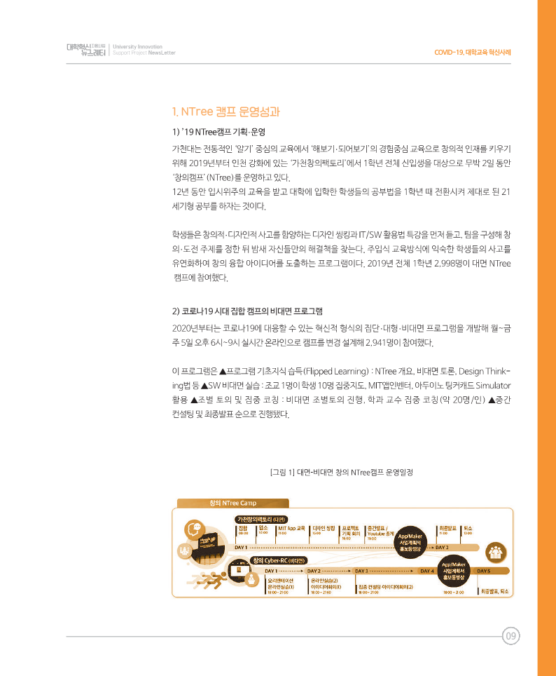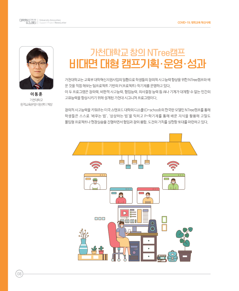* 2021년 7월 31일 발행된 『대학혁신지원사업 총괄소식지 제6호』에 창의 NTree 캠프와 P-학기제가 각각 COVID-19, 대학교육 혁신 사례와 성과사례로 게재되었습니다.