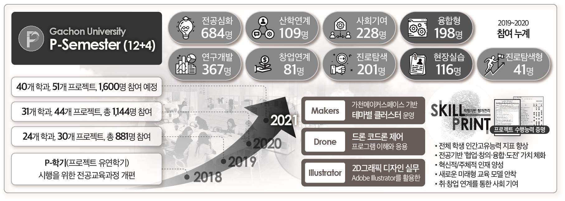 - 3학년 2학기를 ‘P-학기(유연학기)’로 지정하고, ‘12주 일반과목 + 4주 몰입형 프로젝트·현장실습’의 전공필수 교과과정으로 학기를 운영함