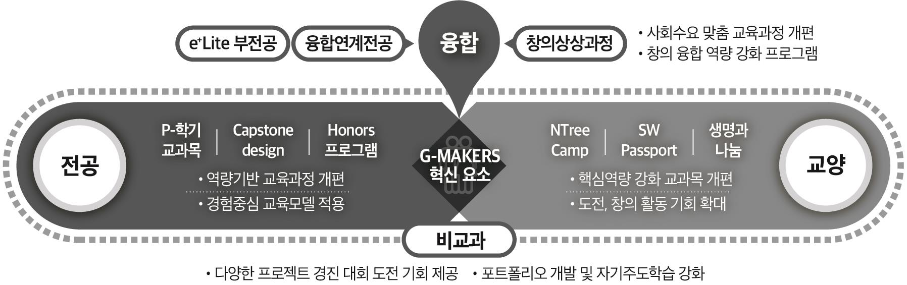 - G-MAKERS 혁신 요소(도전, 맞춤, 역량, 경험, 성찰, 평가)를 반영한 전공·교양·비교과 교육과정 체제를 구축·운영하여 핵심역량을 체화시키고 전인적 교육을 추구함