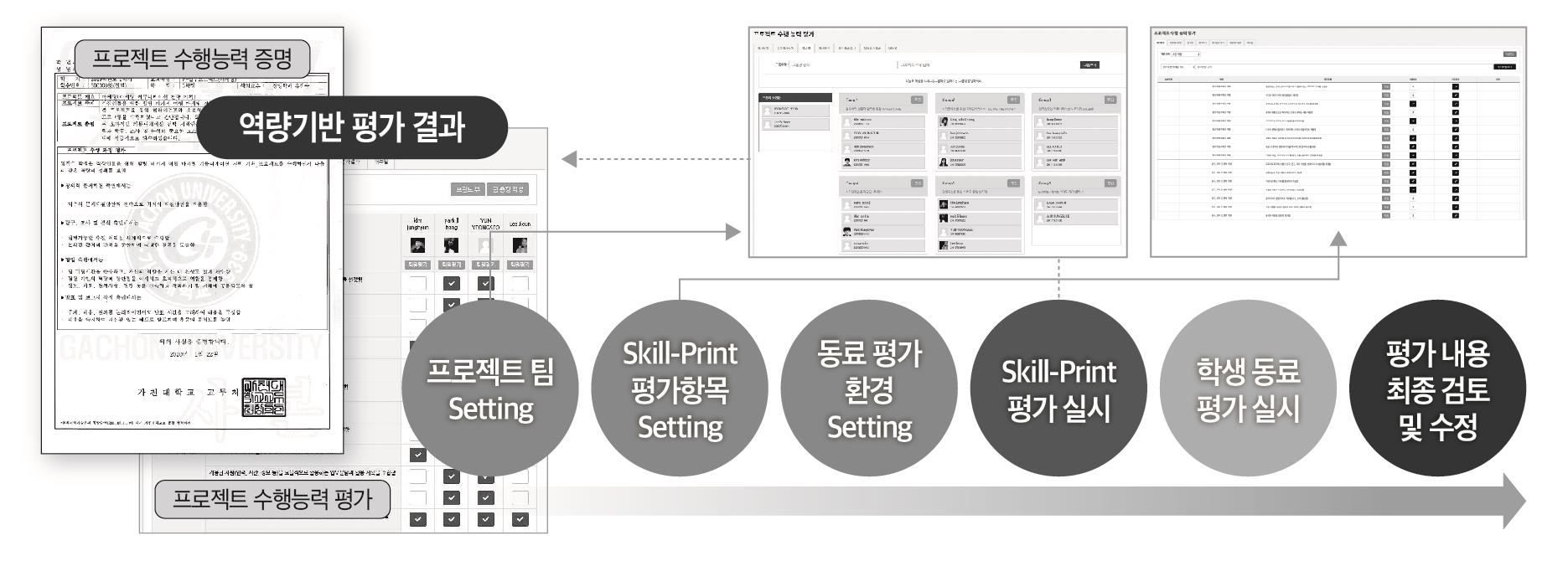 - 역량기반 평가를 수행할 수 있는 지표를 개발하고 시스템으로 평가를 수행할 수 있도록 Skill-Print 평가 시스템을 개발하여 P-실무프로젝트 교과에 성공적으로 적용함