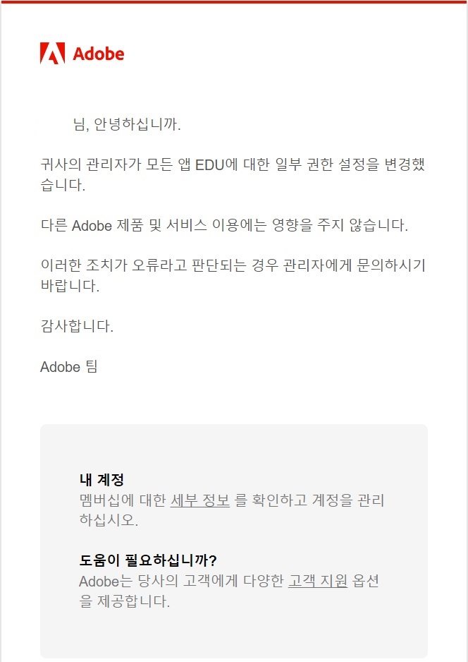기존 계약에서 신규 계약으로 이행 중 명칭 변경(모든 앱 EDU → 모든 앱)으로 인해 발송된 메일로써, Adobe 사용에는 문제가 없습니다.