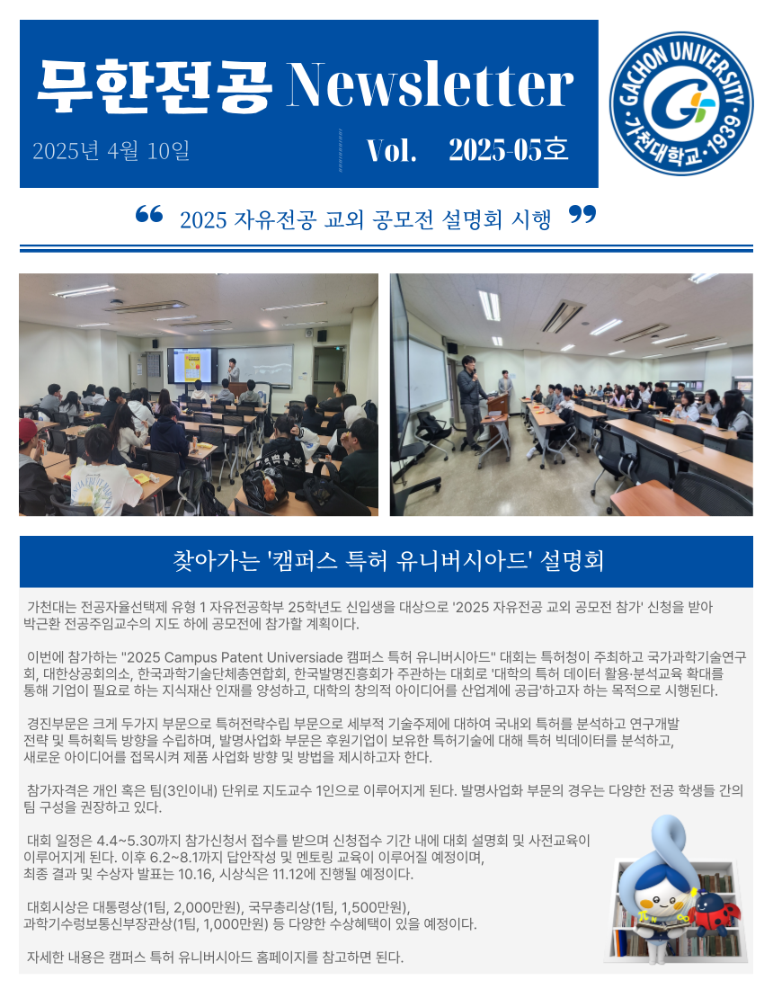 fnctId=bbs,fnctNo=762 글번호 110071 2025 자유전공 교외 공모전 "캠퍼스 특허 유니버시아드" 설명회 수정일 2025.05.23 작성자 가천리버럴아츠칼리지(G) 조회수 231 등록일 2025.05.23