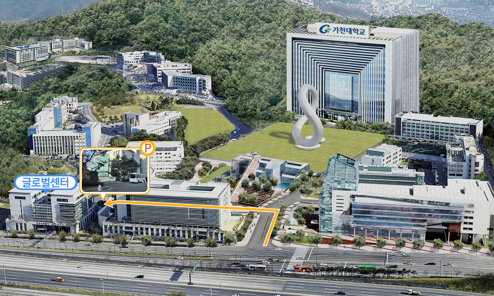 - 차량/도보 이용 시 정문 진입 → 좌측 게이트로 진입 → 좌측 두번째 글로벌센터 건물