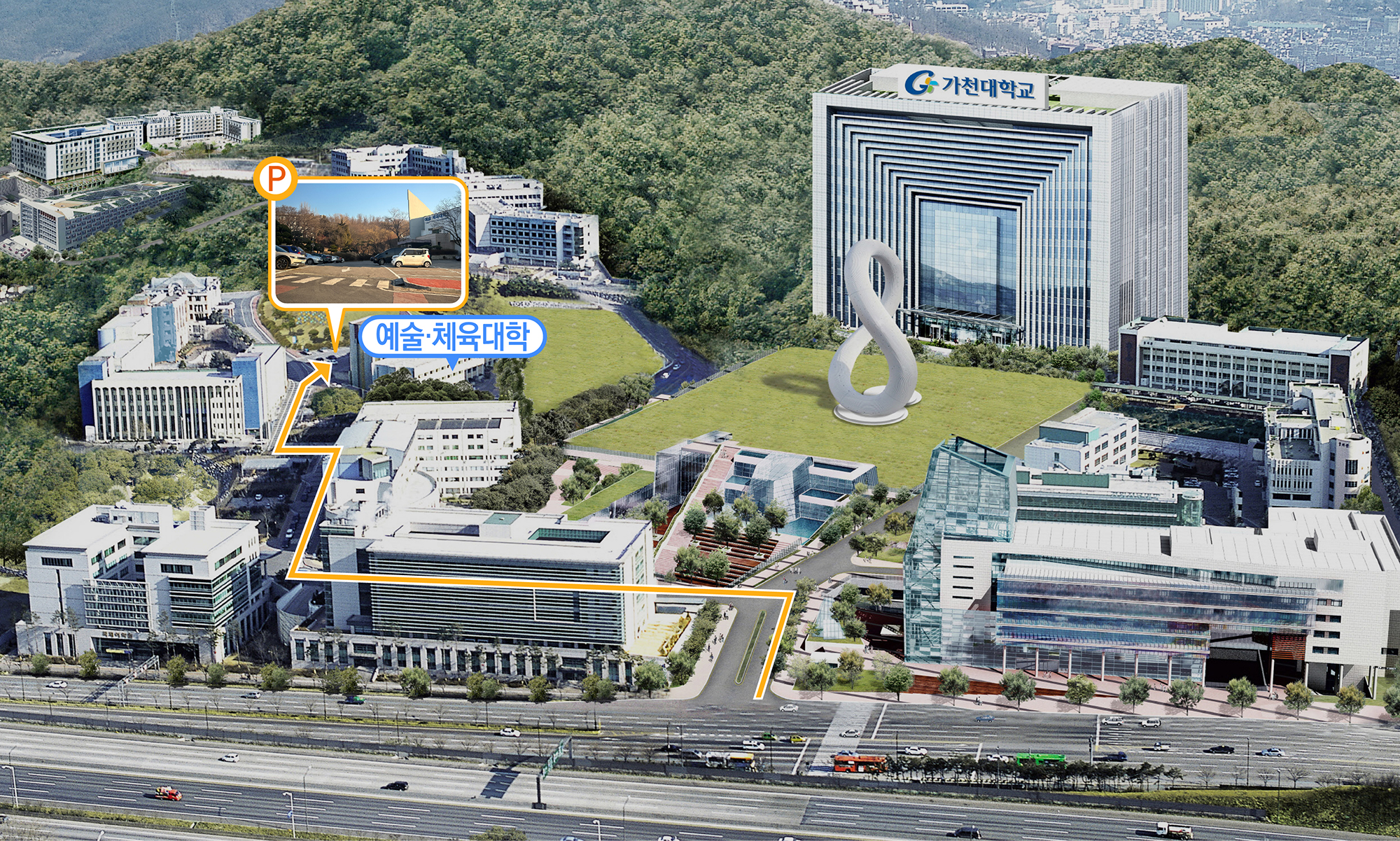 - 정문 진입 → 좌측 게이트로 진입 → 오르막 올라 오른쪽 예술·체육대학2 건물 야외주차장 이용