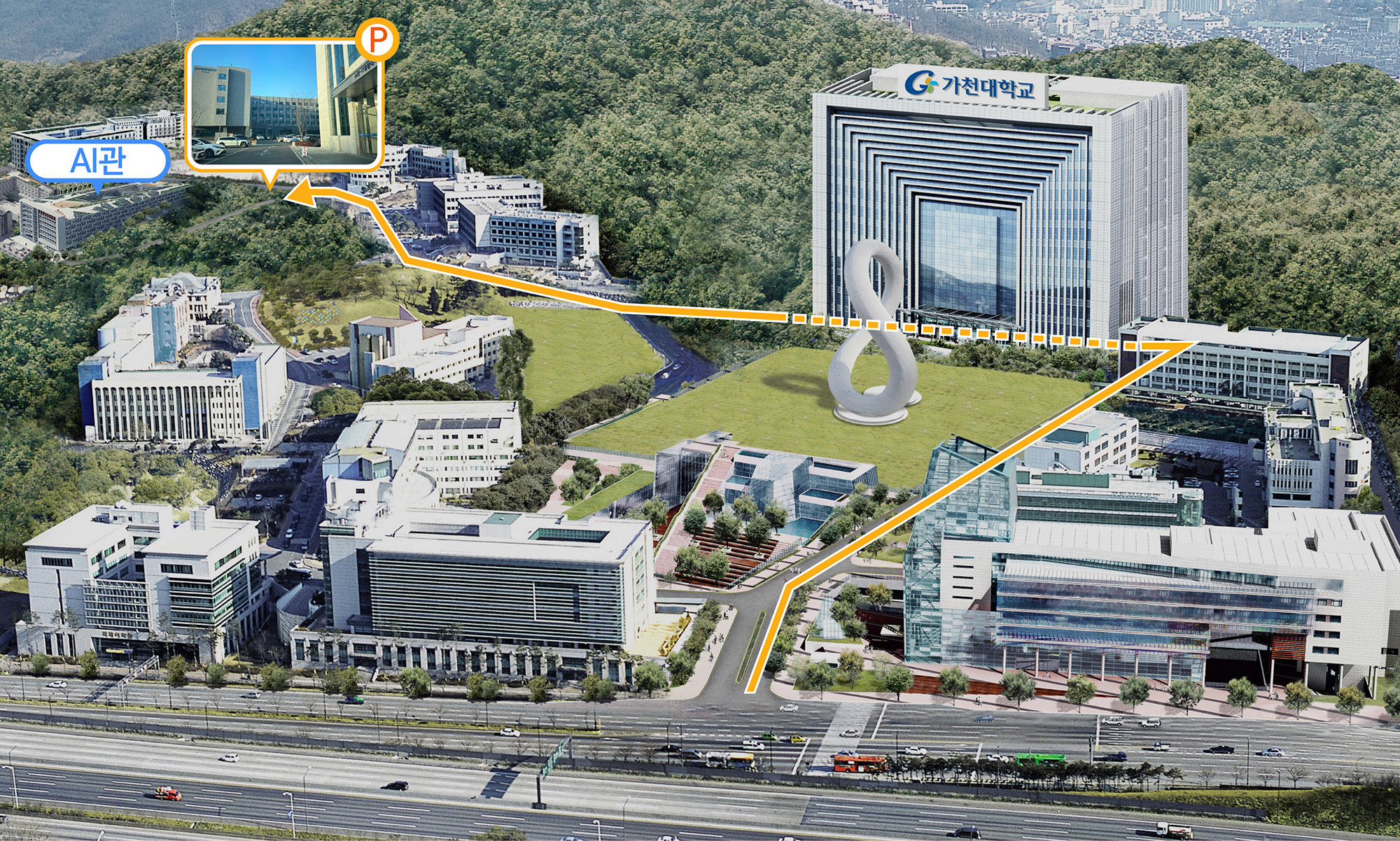 - 정문 진입 → 정면 게이트 진입 → 가천관 우측 터널 통과 → 교육대학원-중앙도서관-학생생활관 지나 AI관 왼편의 AI관 야외주차장(2층) 이용