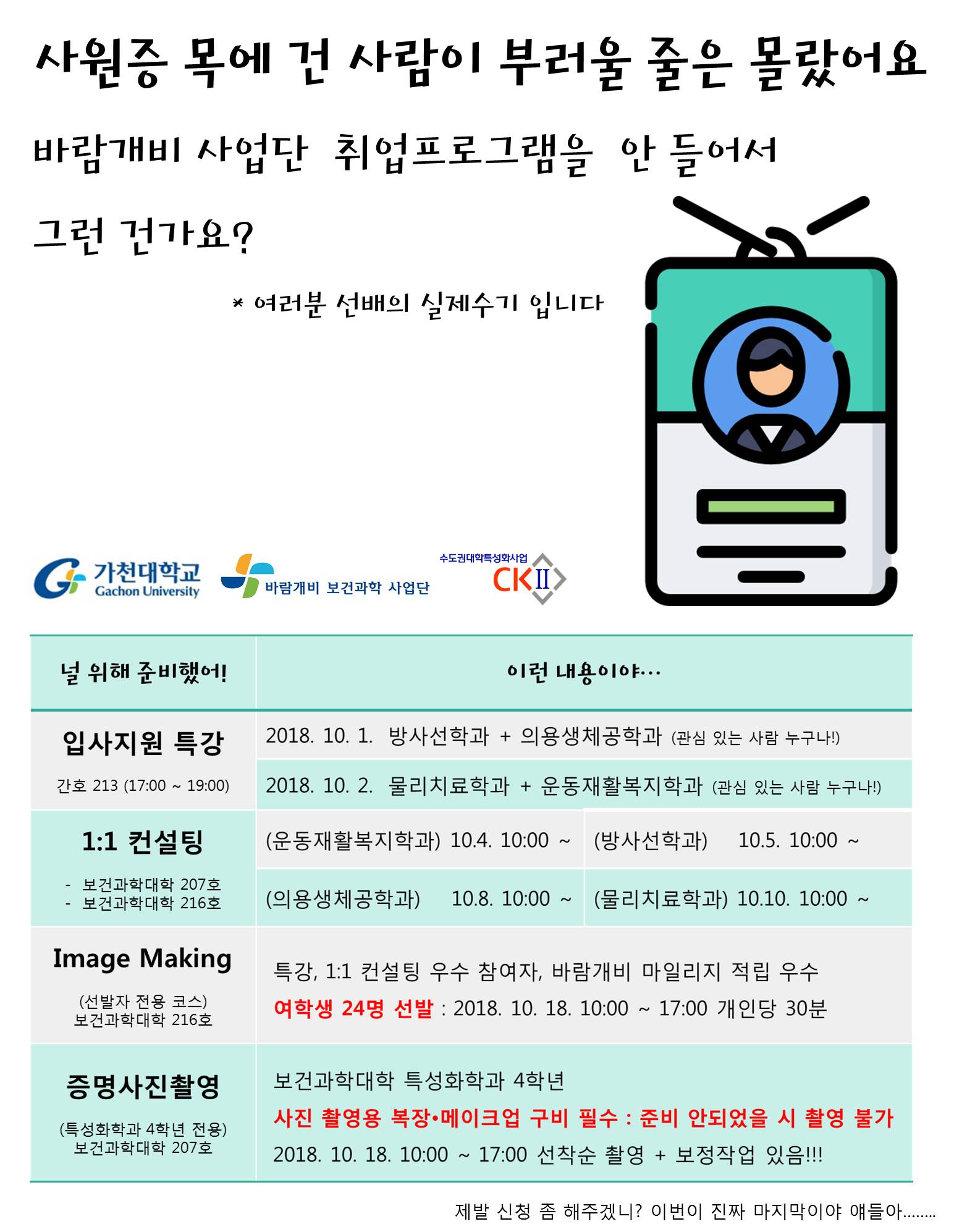 fnctId=bbs,fnctNo=476 글번호 3896 [의과학대학] [특성화]특성화학과 3,4학년 대상 취업프로그램 운영안내 수정일 작성자 보건과학대학 조회수 1484 등록일 2018.09.28