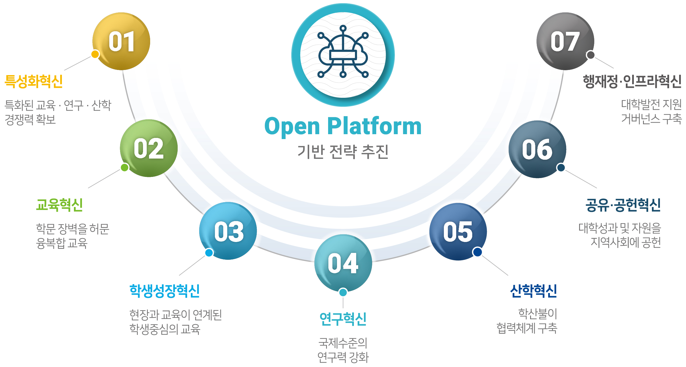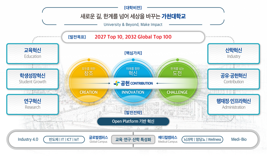 발전계획 추진체계 대학비전 University & Beyond, Make Impact 발전목표 2025 Top 10 - 글로번 명문대학 도약 핵심가치 모두를 위한 창조(CREATE), 한계를 넘는 도전(CHALLENGE), 한발 앞선 변화(CHANGE) 1. 융복합교육 2. 지식공유 3. 실용적연구 4. 글로벌 교류 5. 산학연통합 6. 행재정혁신 발전전략 Open Platform 기반 특성화 글로벌 캠퍼스와 메디컬 캠퍼스는 교육, 연구, 산학을 특성화한다. 발전계획 7대 중점전략 “2027 Top 10, 2032 Global Top 100” 발전목표 달성을 위해 ▲특성화혁신 ▲교육혁신 ▲학생성장혁신 ▲연구혁신 등 7대 중점전략과 31개 세부 핵심과제를 설정함 Open Platform 기반 전략 추진 1. 융·복합 교육학문 장벽을 허문 융·복합 교육 2. 지식공유대학 성과 및 자원을 지역사회와 공유 3. 글로벌 교류교육,연구,취업의 글로벌화 4.실용적 연구사회와 기업에 필요한 실용 연구 5. 산학연통합학문 장벽을 허문 융복합 교육 6.행·재정 혁신대학발전을 지원하는 행·재정혁신
