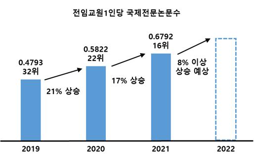 - 대학혁신지원사업 시작 이전 대비 전임교원1인당 국제전문논문수 41% 및 전국대학 순위 16계단 상승