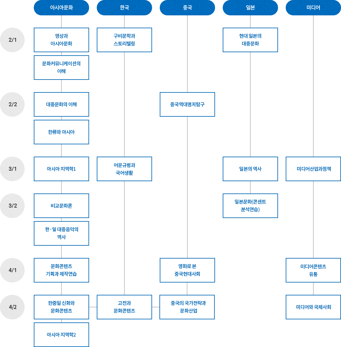 한·일 대중음악의 역사(3)일본문화(컨텐츠 분석연습)(3) 4-1 문화 컨텐츠 기획과 제작 연습(3) 영화로 본 중국현대사회(3) 미디어콘텐츠유통(3) 4-2 한중일 신화와 문화컨텐츠(3)