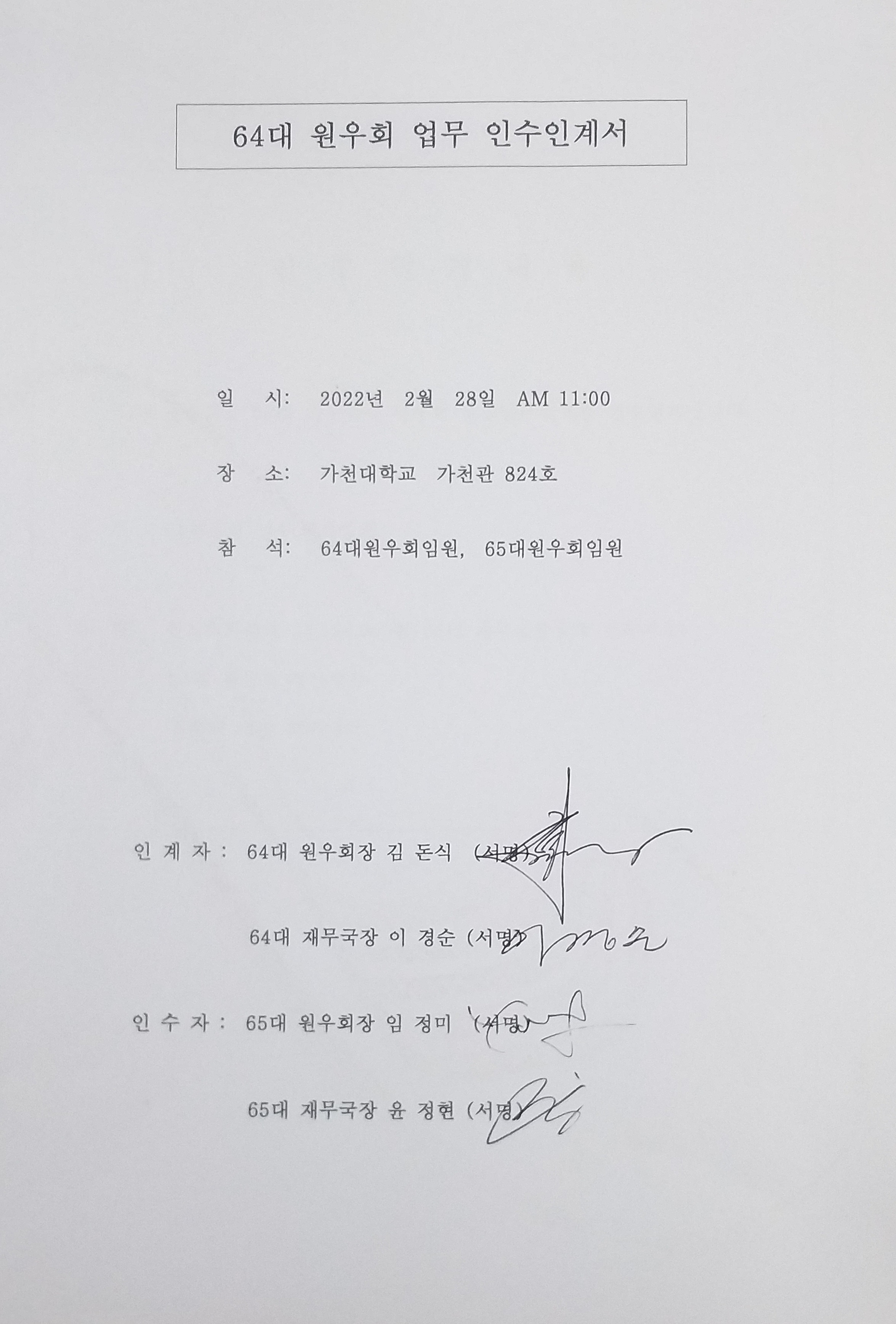 fnctId=bbs,fnctNo=728 글번호 71768 원우회업무인수 인계 수정일 2022.02.28 작성자 이경순 조회수 895 등록일 2022.02.28 64대 임원, 65대 임원 업무 인수인계