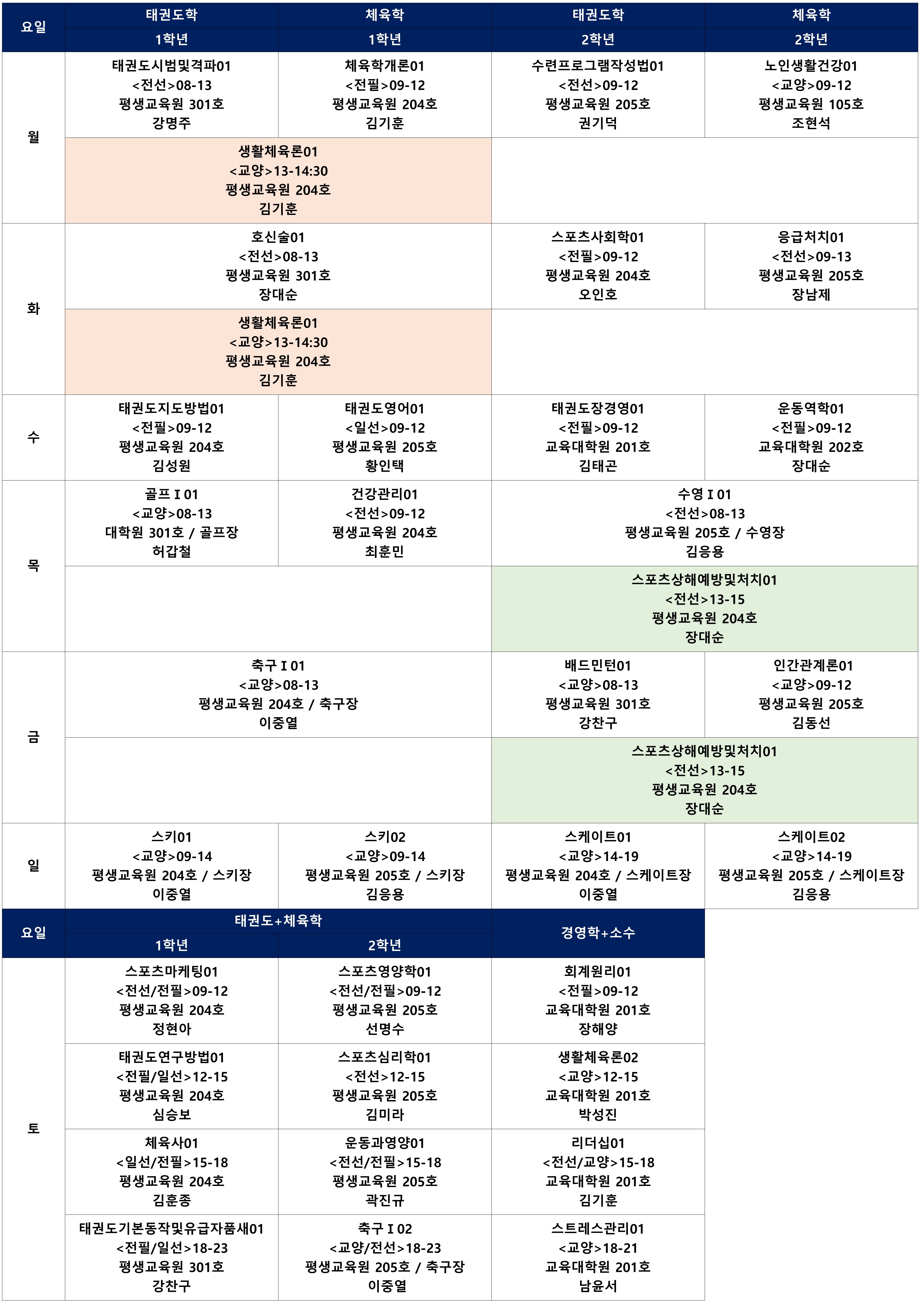 2025-2학기 태권도학, 체육학, 경영학전공 시간표
