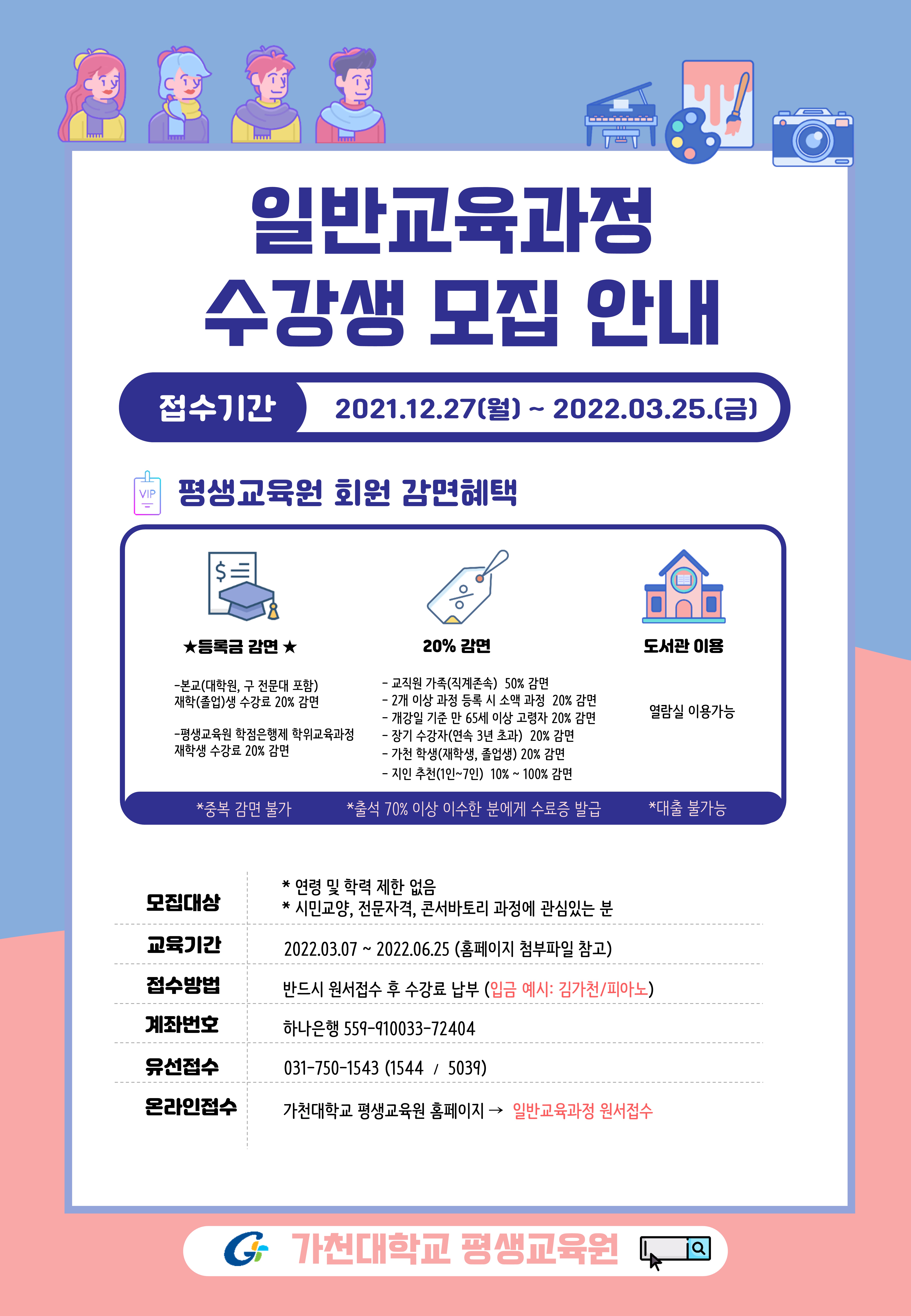 fnctId=bbs,fnctNo=287 글번호 71646 2022-1학기 신규 수강생 모집 안내(링크) 수정일 2022.02.24 작성자 평생교육원(G) 관리자 조회수 1796 등록일 2022.02.24 링크 주소 : 커뮤니티 -> 공지사항 -> [일반교육과정]2022-1학기 수강생 모집 안내 아래 포스터를 클릭하시면 해당 사이트로 이동됩니다.