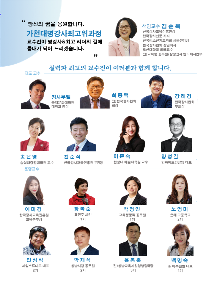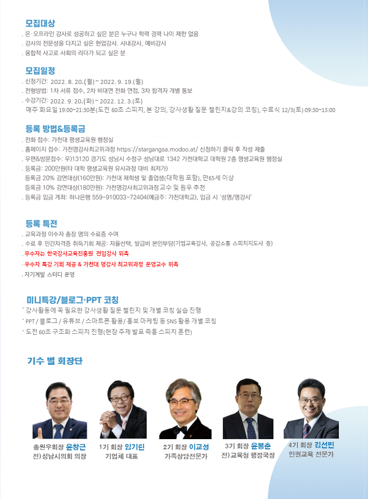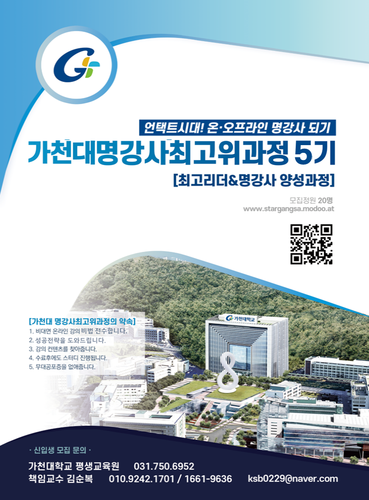 fnctId=bbs,fnctNo=288 글번호 78312 2022-2학기 가천 명강사 최고위과정 수정일 2022.08.22 작성자 평생교육원(G) 관리자 조회수 1299 등록일 2022.08.22 가천대 명강사 최고위과정