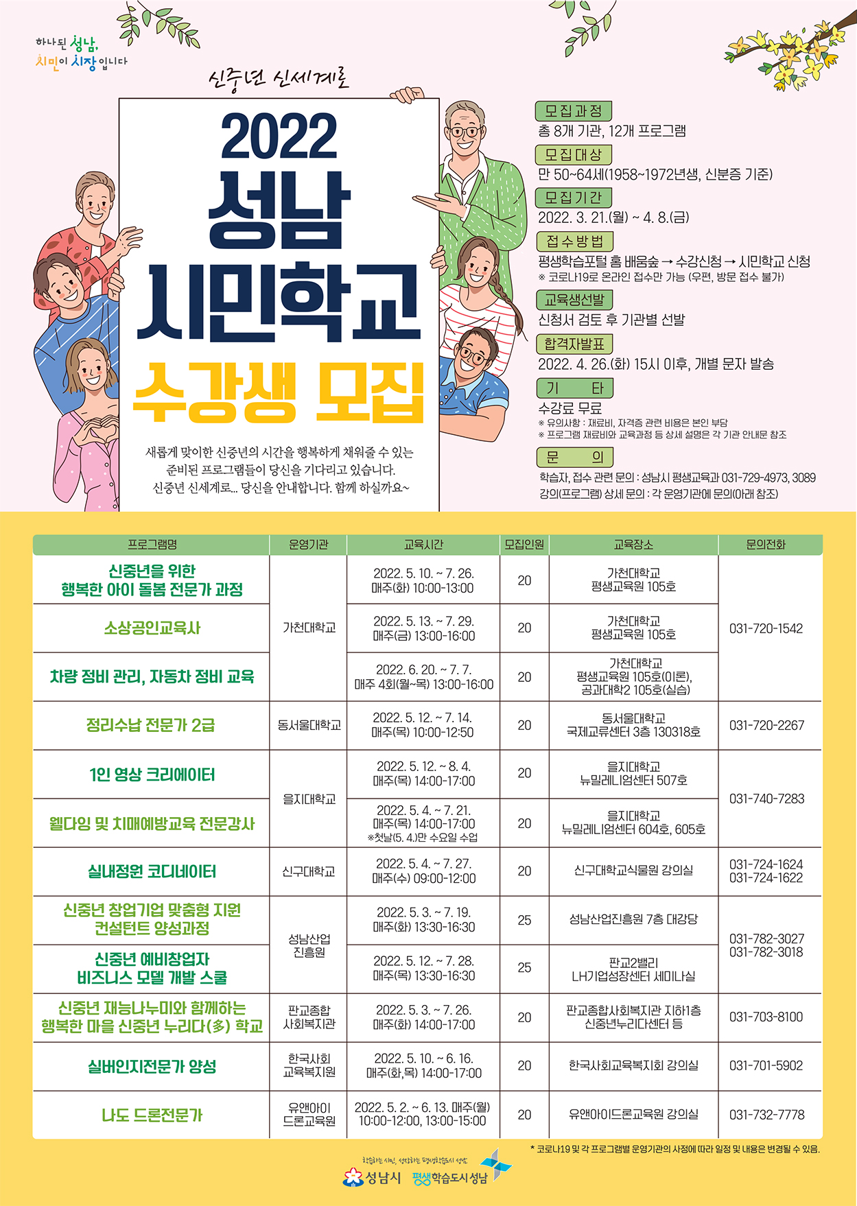 fnctId=bbs,fnctNo=1179 글번호 73307 2022 성남시민학교 수강생 모집 수정일 2022.04.05 작성자 평생교육원(G) 관리자 조회수 2028 등록일 2022.04.05 * 성남시민학교 모집 url : https://learning.seongnam.go.kr/index.do * 관련 문의 : 031-750-5038 첨부파일 (홍보 포스터)2022년 성남시민학교 수강생 모집[8293].jpg 미리보기
