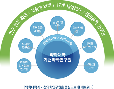 가천약학연구원은 산·학·연 협력 네트워크를 효율적으로 운영하기 위해 독립기관으로 운영될 예정이며, 가천의 내부 인프라(가천의학전문대학원, 뇌과학연구소, 이길여 암·당뇨연구원, 임상시험센터, 송도 BRC)에서 산출된 연구 성과 공유 시스템을 구축함으로써 공동연구 네트워크를 강화해 나갈 것입니다. 또한 연구효율의 극대화를 위해 서울대 약대, 생명공학연구원, 제약회사 등의 외부 인프라 확대는 물론 연구 성과를 바탕으로 지속적인 외부 협력 기관 확대를 통해 우리나라 약학 분야 질적 향상에 기여할 것입니다.