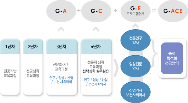 - 약학교육의 G-ACE 프로그램 전공기반 심화 교육과정 : 1, 2학년 과정. 필수 교과목(약물과학, 생명약학, 산업약학, 임상약학, 사회약학)에 대한 교육