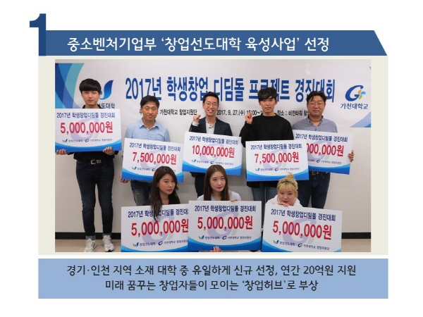 1. 중소벤처기업부 ‘창업선도대학 육성사업’ 선정 미래 꿈꾸는 창업자들이 모이는 ‘창업허브’로 부상 가천대학교가 중소벤처기업부가 주관하는 ‘2017 창업선도대학 육성사업’에 경기·인천 지역 소재 대학 중 유일하게 신규 선정됐다. 가천대는 ‘융합기술 성공 창업 전진 기지화’를 비전으로 삼고 △BICT(생명공학·정보통신기술) 융합 성공창업 육성 모델 구축 △글로벌기업 10개 육성 △75개 융합기술 스타트업 양성 △창업 친화적 학제 및 환경 구축 △예비창업가 6천명 교육 및 육성 등을 3년간 중점 목표로 추진하고 있다. 가천대는 체계적으로 (예비)창업자들을 지원하기 위해 총장직속 독립기구로 창업지원단을 조직했으며 운영본부, 창업교육센터, 창업사업화지원센터, 창업보육센터 등 4개 하부조직을 두어 각 분야의 전문성을 더하고 있다.