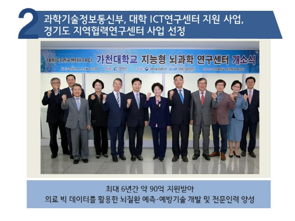 2. 과학기술정보통신부, 대학ICT연구센터 지원 사업 선정, 6년간 약 45억 지원받아 경기도 지역협력연구센터 사업도 선정 가천대학교 ‘지능형 뇌과학 연구센터’가 지난 6월 과학기술정보통신부 2017년도 대학ICT연구센터에 선정됐다. 연구센터는 최대 6년간 약 45억원을 지원받아 의료 빅데이터를 활용한 뇌질환 예측·예방기술 개발 및 전문인력을 양성한다. 가천대는 경기도 지역협력연구센터 사업에도 인공지능헬스케어연구센터가 선정돼 최대 6년간 53억원을 지원받는다. 가천대는 두 사업간의 시너지를 극대화해 의료 빅데이터를 활용한 뇌질환 연구와 전문 인력 양성에 힘을 쏟고 있다.