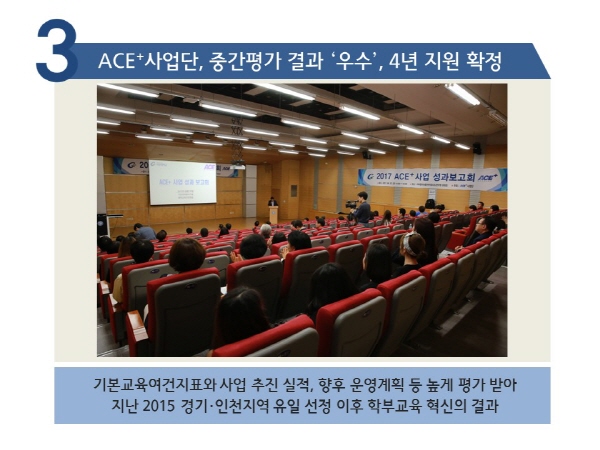 3. ACE+사업단, 중간평가 결과 ‘우수’, 4년 지원 확정 가천대학교는 교육부와 한국대학교육협의회가 실시한 대학자율역량강화지원사업(ACE+)중간평가 결과 우수한 성적으로 추가 지원이 확정됐다. 가천대학교는 지난 2015년 경기·인천지역 유일하게 선정에 이어 기본교육여건지표와 사업 추진 실적, 향후 운영계획 등을 구분하여 시행한 중간평가에서 수도권 대학 평균보다 높은 점수를 받았다.