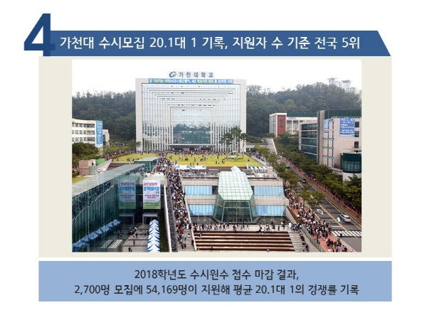 4. 가천대 수시모집 20.1대1 기록, 지원자 수 기준 전국 5위 가천대학교가 2018학년도 수시원서 접수 결과, 2,700명 모집에 54,169명이 지원해 평균 20.1대 1의 높은 경쟁률을 기록했다. 지원자 수 기준으로 전국 5위에 해당한다. 가천대 의대도 15명 모집에 464명이 지원, 30.9대1의 경쟁률을 기록했다. 이는 학생부종합 전형으로 선발하는 전국 의대 중 1위로 가장 높은 경쟁률을 자랑한다.