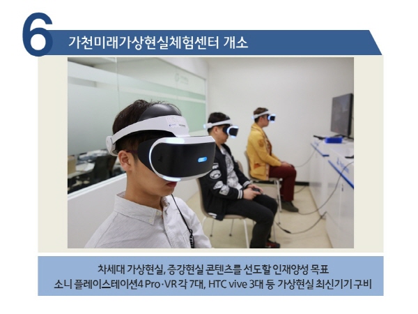 6. 가천미래가상현실체험센터 개소 가천대가 차세대 가상현실, 증강현실 콘텐츠를 선도할 인재를 양성하기 위해 가천미래가상현실체험센터를 지난 4월 열었다. 가천미래가상현실체험센터는 대학 비전타워 지하3층에 위치해 있으며 99.173m² 규모로 소니 플레이스테이션4 Pro 7대, 소니 플레이스테이션 VR 7대, HTC vive 3대 등 가상현실을 체험할 수 있는 최신기기를 갖추고 있다. 학생들은 최신기기를 활용하고 학생들은 수업시간에 가상현실 콘텐츠를 직접 디자인하고 시연해 볼 수 있어 교육의 질을 획기적으로 높일 수 있을 것으로 기대된다.