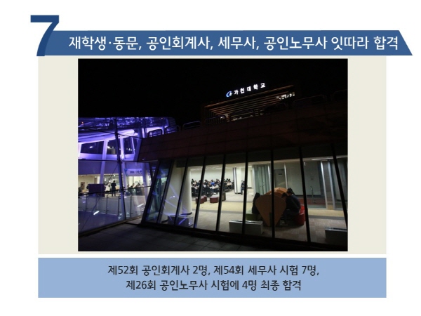 7. 가천대 재학생·동문, 공인회계사, 세무사, 공인노무사 잇따라 합격 재학생과 졸업생들이 공인회계사, 세무사, 공인노무사에 잇따라 합격했다. 제52회 공인회계사에 회계·세무학과 이정환 동문(06학번) 등 2명이 최종합격했으며 제54회 세무사 시험에서도 글로벌경제학과 4학년 김준희(11학번) 학생 등 7명이 최종합격했다. 법학과 4학년 심규만 학생(11학번) 등 4명이 제26회 공인노무사 시험에 최종 합격해 가천대의 저력을 보였다.