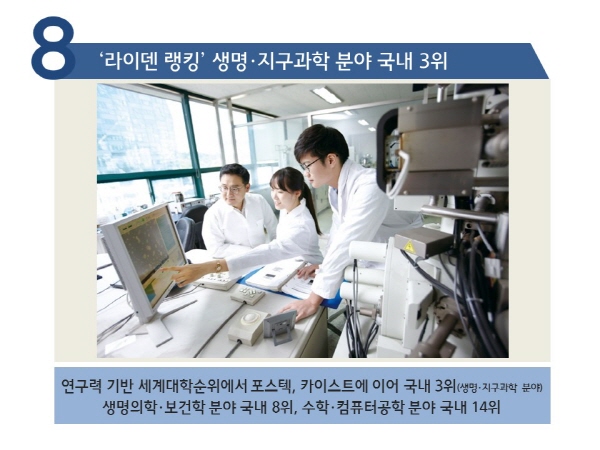 8. ‘라이덴 랭킹’ 생명·지구과학 분야 국내 3위, 전체랭킹 국내 21위로 연구력 인정 가천대가 논문의 질을 기반으로 세계대학순위를 매기는 ‘2017 라이덴 랭킹’에서 생명·지구과학 분야에서 포스텍, 카이스트에 이어 국내 3위를 차지했다. 생명의학·보건학 분야는 국내 8위, 수학·컴퓨터공학 분야는 국내 14위를 차지했으며 종합 랭킹은 21위를 기록했다. 라이덴 랭킹은 네덜란드 라이덴대학 과학기술연구센터(CWTS)가 대학 연구력을 가늠할 수 있는 논문을 기준으로 평가하는 세계대학 순위다. 전체 논문 대비 인용도가 높은 상위 10%의 ‘질’과 ‘비율’에 중점을 둔 순위로 대학의 ‘규모’와 논문의 ‘양’ 등을 고려하지 않는 것이 특징이다.