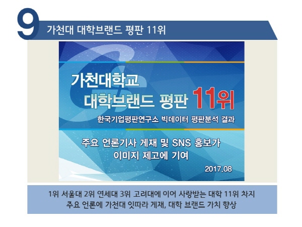 9. 가천대학교 대학브랜드평판 11위 주요 언론에 가천대 잇따라 게재, 대학 브랜드 가치 향상 가천대가 국내 소비자에게 사랑받는 대학에 대한 빅데이터 평판분석에서 100개 주요대학 중 11위를 차지했다. 1위는 서울대, 2위는 연세대, 3위는 고려대가 이름을 올렸다. 이같은 결과는 한국기업평판연구소가 지난 6월 12일부터 2017년 7월 13일까지 브랜드 빅데이터 71,813,649개를 분석한 자료에서 나타났다. 또한 중앙일보, 동아일보, SBS 등 주요언론에 가천대 관련 우호적인 기사 및 인터뷰가 게재되고 페이스북 등 SNS를 통한 활발한 홍보활동이 브랜드 가치 향상에 기여했다는 평가이다.