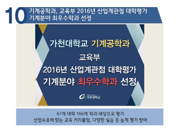 10. 기계공학과, 교육부 2016년 산업계관점 대학평가 기계분야 최우수학과 선정 가천대학교 기계공학과가 지난 4월 교육부와 한국대학교육협의회가 현장맞춤형 교육과정 운영우수대학을 선정하는 ‘2016년 산업계관점 대학평가’에서 기계분야 최우수학과로 선정됐다. 산업계관점 대학평가는 대학이 산업수요에 맞는 교육체제를 갖춰야한다는 경제 5단체 등의 요구를 반영해 2008년부터 시행 중인 사업으로 기계·건축·토목·자동차·조선 등 5개 분야에 관련 학과가 설치된 대학 중 참여를 희망한 67개 대학의 166개 학과를 대상으로 실시됐다. 평가참여대학 중 최우수 학과로 선정된 대학은 가천대를 비롯 39개 대학이다.