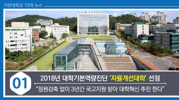 가천대가 교육부 대학기본역량진단 결과 ‘자율개선대학’으로 선정됐다. 기본역량진단은 지난 2015년 시행된 1주기 대학구조개혁평가에 이어 대학의 역량을 종합적으로 판단, 대학 발전을 지원하고 부실 대학을 가려내기 위해 진행됐다. 전국 4년제 대학 187개 및 전문대학 136개 등 전국 323개교 대학을 대상으로 실시하였으며 자율개선대학에는 207개교(일반대학 120개교, 전문대학 87개교)가 선정됐다. 자율개선대학 선정으로 정원감축 없이 2019년부터 3년간 국고지원을 받아 중장기 발전계획에 따른 대학혁신사업을 추진할 수 있게 됐다.
