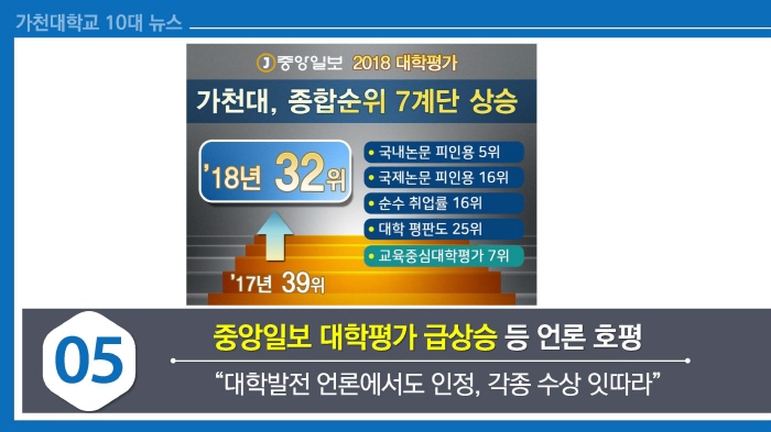 가천대가 중앙일보 대학평가 등 각종 언론사 대학평가에서 좋은 성적을 거뒀다. 10월 발표된 2018 중앙일보 대학평가에서 지난해보다 7계단 상승한 32위를 기록했다. 국내논문 피인용 5위, 교육중심대학평가 7위, 국제논문 피인용 16위, 순수취업률 16위, 대학평판도 25위 등 대부분의 지표가 상승해 종합순위 상승을 이끌었다. 단기간에 순위가 급상승하는 것은 이례적인 일이다.