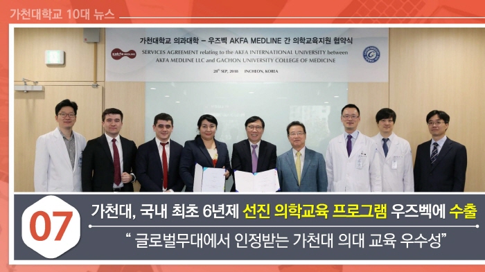 가천대 의과대학이 우즈베키스탄의 아크파메드라인 의료센터(AKFA Medline, CFO 카몰라트 미르잘리에바)와 MOU를 체결하고 의료 교육 및 기술 선진화를 위한 노하우 전수에 협력키로 했다. 국내 40개 의과대학 중 의학교육 수출은 이번이 처음이다. 아크파메드라인 의료센터는 우즈베키스탄 최초의 6년제 사립 의과대학을 을 내년 9월 1일 개교하며 앞으로 학년 당 200명의 학생을 선발할 예정이다. 가천대 의대는 6년 반 동안 총 200만불 규모의 선진 의학교육 프로그램을 전수한다.