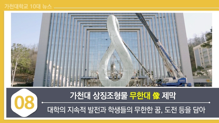 가천대학교의 무한(無限) 발전을 기원하고 미래 핵심인재로 성장할 학생들의 꿈과 희망을 응원하기 위해 ‘무한대’를 상징화한 조형물이 대학의 중심부인 가천관 앞 잔디광장에 설치됐다. 가천대 김유선 석좌교수 작품으로 기획부터 설치까지 2년이 걸렸으며 작품의 규격은 8m(폭)×10m(넓이)×19m(높이)로 아파트 7층높이에 달한다. 조형물은 Bending(굽힘가공 : 강판이나 형강을 곡면이나 곡선으로 굽히는 작업) 후 캠퍼스로 옮겨 조립하는 방식으로 설치됐다.
