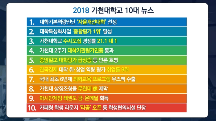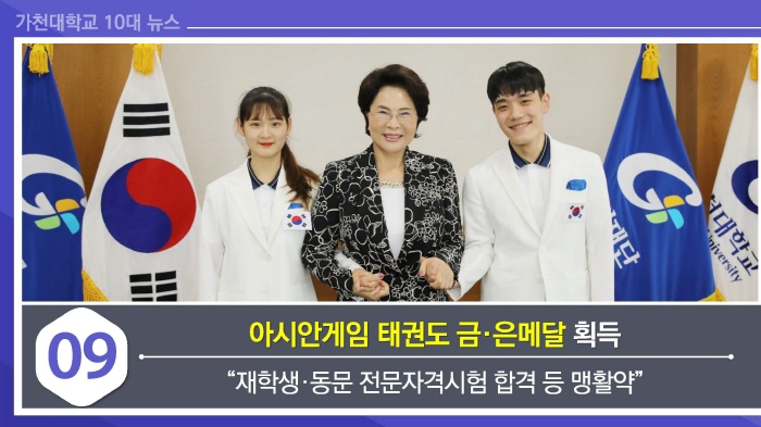 태권도전공 한영훈, 박재은학생이 아시안게임 태권도 품새 남·여 단체전에서 각각 금·은메달을 획득했으며 기계공학과 학생들로 구성된 완벽한 파트너팀은 창의적 종합설계 경진대회에서 산업통상자원부 장관상을 수상했다. 이와함께 한의학과 4학년 이상진 학생이 제73회 한의사 국가시험에서 수석합격의 영예를 안았다. 가천대는 제70회 한의사 국가시험에서 이보람씨가 수석합격한데 이어 두 번째 수석합격자를 배출했다. 간호학과 이주희 동문도 2018학년도 경기도 공립 중등교사 임용시험 보건(초등)부문에서 수석합격했다.